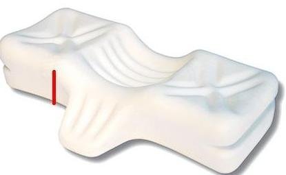 而市面上幾乎很少看到完美的枕頭,而處在睡眠的狀態,又很難交替使用二顆、一顆枕頭互換,而筆者找來找去,終於發現了一顆加拿大製的完美枕頭,其形狀特別,一顆枕頭就適合平躺和側躺。而下圖的紅線距離指的是需透過側量,來決定側躺時的枕頭高度,所以都可以找到適合每個人的尺寸,而前方凸出的部位則是支撐頸部和肩頸交接處的部位。另外此枕頭不適合趴睡,同時趴睡也會對頸椎產生很大的壓力,應儘可能避免趴睡的姿勢。